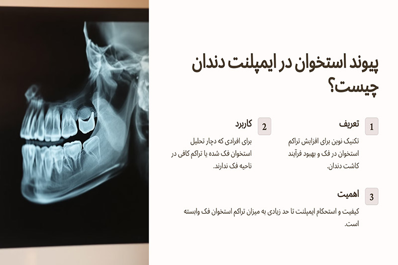 پیوند استخوان برای ایمپلنت چیست؟جراحی برای افزایش تراکم استخوان فک که امکان کاشت ایمپلنت را برای افرادی که تراکم استخوان کافی ندارند، فراهم می‌کند.