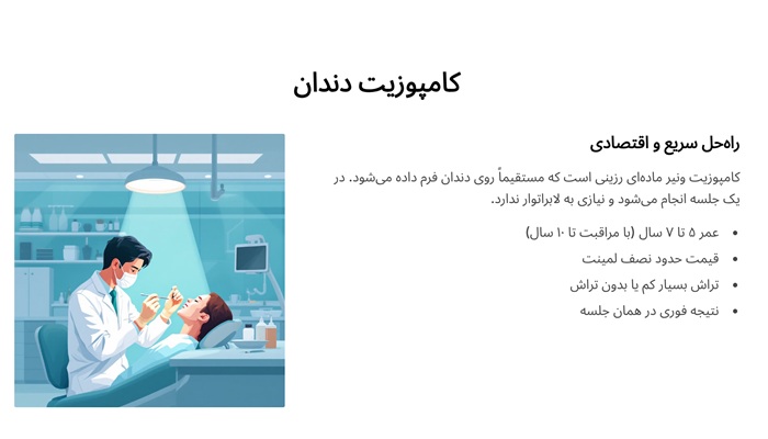 | مورد مقایسه | لمینت سرامیکی | کامپوزیت دندان | ایمپلنت دندان |